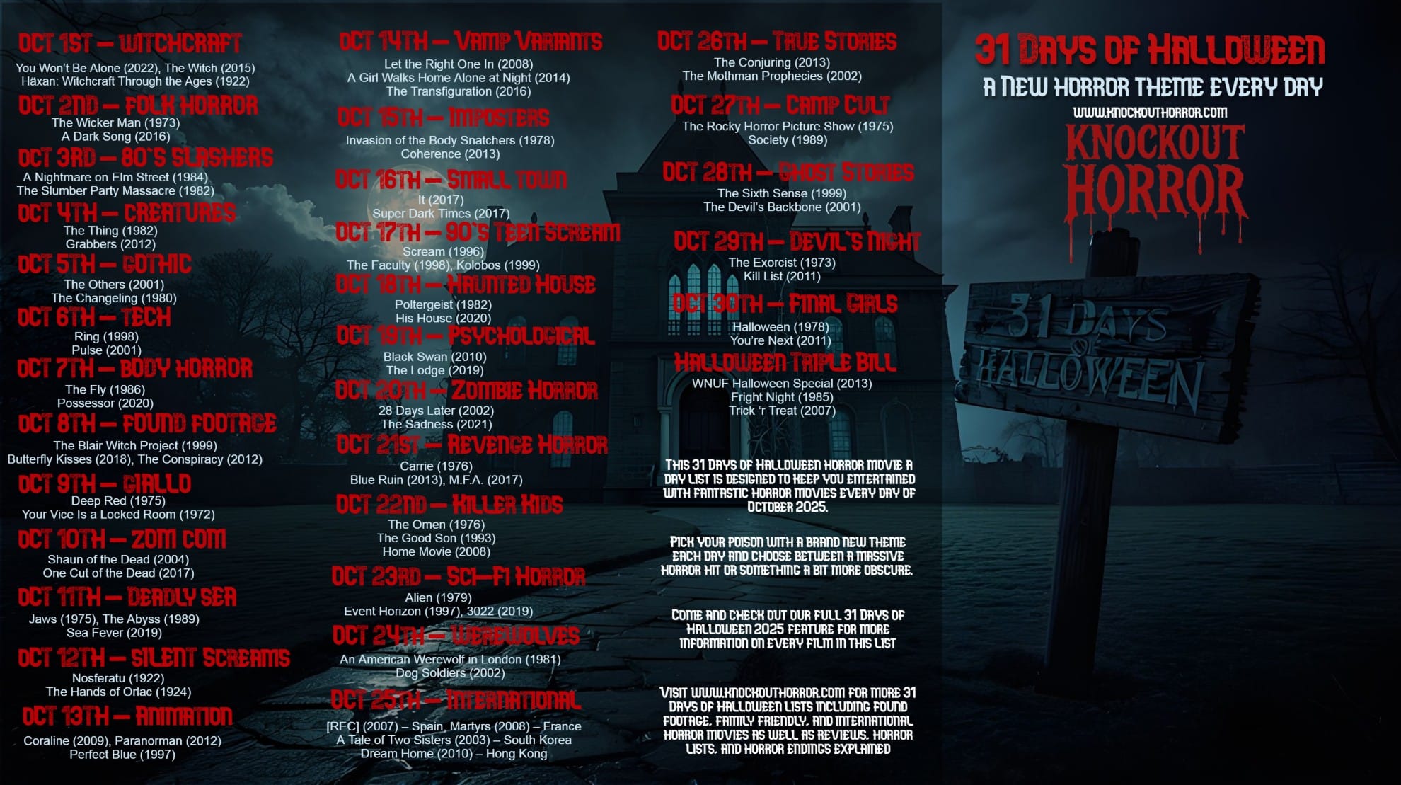 Welcome to Knockout Horror. If you are new here, we review horror movies, explain horror movie endings, and put out horror movie ranking lists. Today, we are bringing you our 31 Days of Halloween List for 2025.